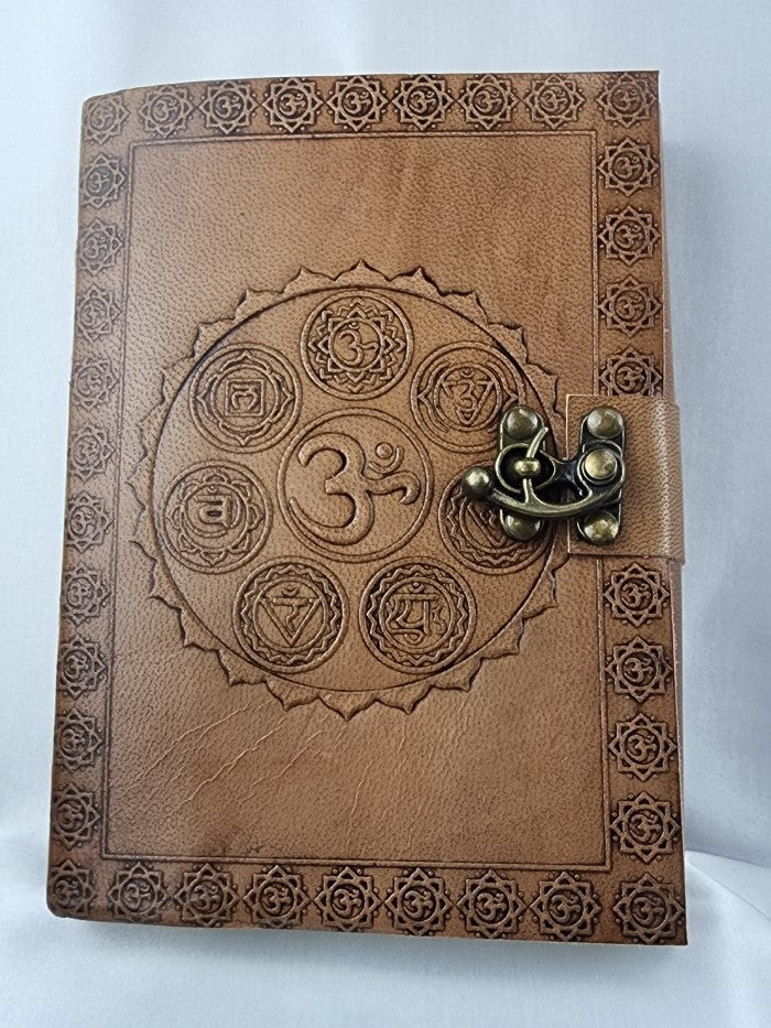 Seven Chakra embossed leather journal Leather with an aged look. containing around 192 hand made paper closes with latch.